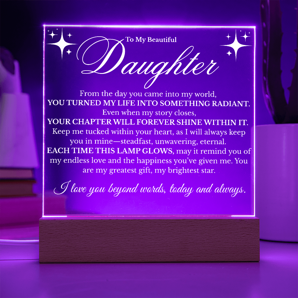From the moment she entered your life, your daughter became your brightest joy. This beautifully designed LED acrylic plaque lamp captures that love in words and light, making it a keepsake she’ll treasure forever.